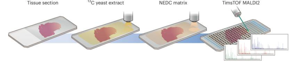 方法:利用¹³C标记酵母提取物作为通用内标,在基质喷涂前喷涂于组织切片表面,使用timsTOF flex MALDI-2质谱仪在负离子模式下进行检测。