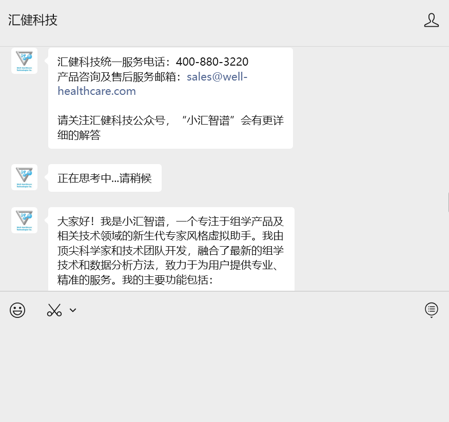 为了能向用户提供更及时、高效、便捷的线上服务,汇健公众号智能体——“小汇智谱”正式上线!您可在汇健公众号享受7×24小时不间断的智能咨询服务,随时随地解决您的疑问。 只需进入汇健科技公众号后台,在对话框直接向“小汇智谱”提问即可。智能助手将基于汇健科技公众号历史内容与专属知识库,为您提供准确、专业的解答。 实时回答产品与业务咨询 快速提供技术资料与使用指引 智能推荐相关文章与解决方案 …… 随时问、随时答,小汇智谱将用心聆听、专业回复。 关注汇健科技公众号,体验高效便捷的智能服务!